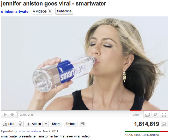 Smartwater's brand channel was a neglected corner on YouTube until 07/03/11. Prior to the launch of their effort with the Friends star, their uploads had been viewed a total of 4,739 times. Even the trailer for the new ad only got 554 views.