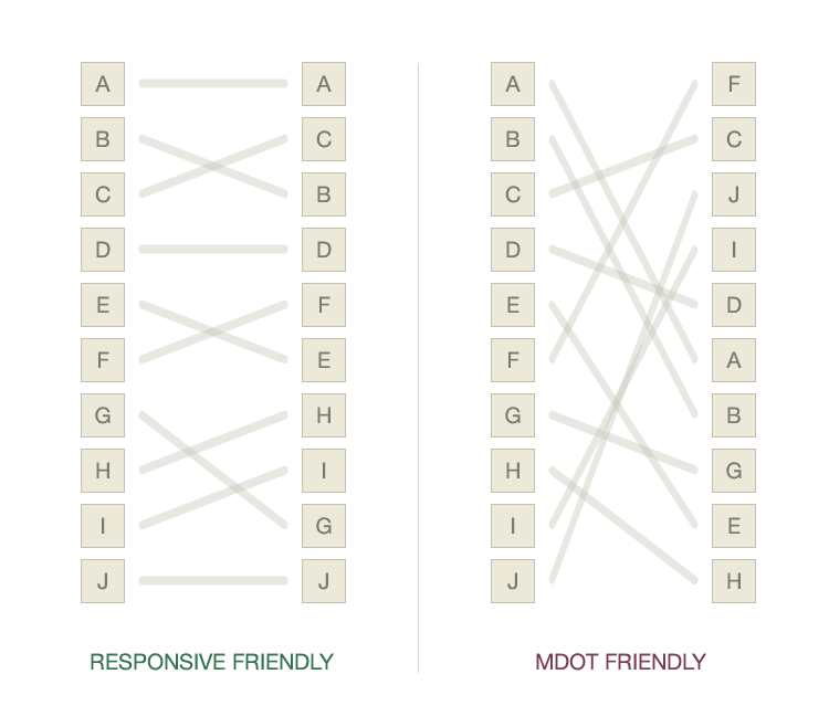 If your letters are joining up simply like in the left chart, responsive is the way to go. When your priorities are similar from desktop to mobile, it becomes clear that you can join in on the responsive fun. However, if you have a very muddled-up and confused chart like the one on the right, the best option is a separate mobile site, also known as MDOT.